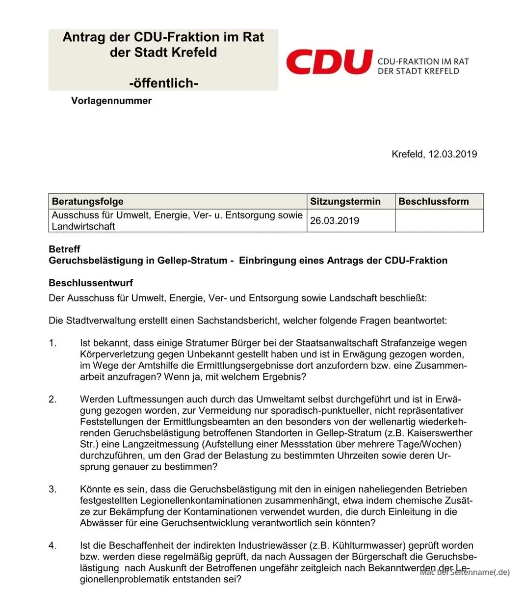 Die CDU Krefeld Bezirk Uerdingen/Gellep-Stratum hat einen Antrag zur Prüfung der Geruchsbelästigung ausgearbeitet.