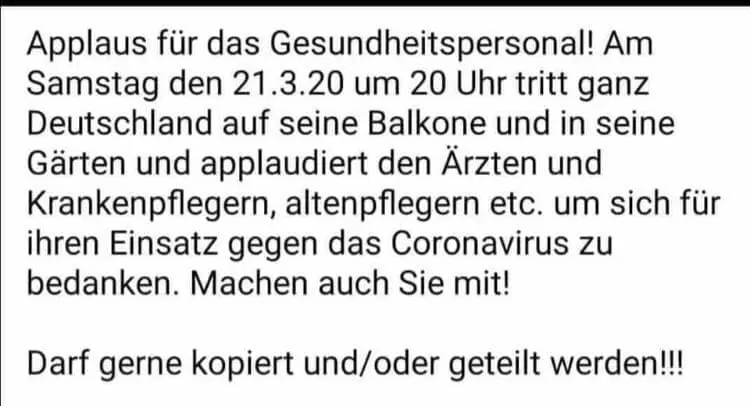 "Applaudieren für das Gesundheitspersonal!" Am Samstag, den 21.03.2020 um 20 Uhr tritt ganz Deutschland auf seine Terrassen, Balkone oder an die geöffneten Fenster und applaudiert den Ärzten/innen, Krankenpflegern/innen, Altenpflegern/innen und alle weiteren, im gesundheitssystem Beschäftigten, um sich für ihren Einsatz gegen das Coronavirus zu bedanken.