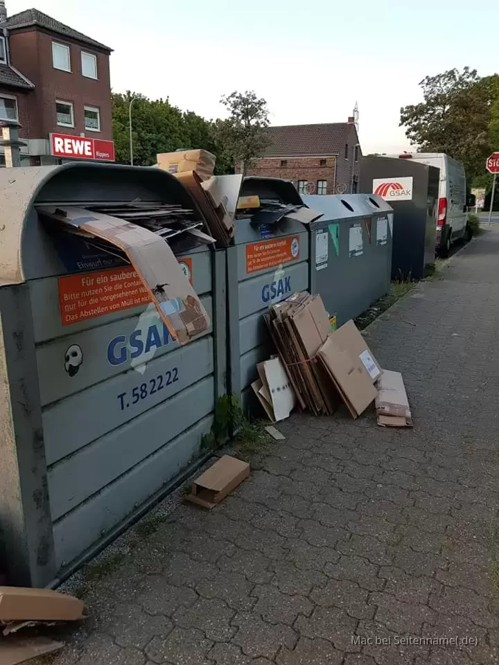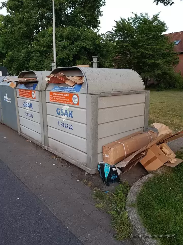 Ist ein Container voll (hier ist es egal ob Glas oder Papier), dann nehme ich meinen Müll wieder mit, bringe ihn an einen anderen Standort, oder aber - wenn auch diese voll sind: Dann nehme ich den Müll wieder mit nach Hause. Andere Optionen gibt es nicht, denn einfach alles daneben liegen lassen, ist NICHT ERLAUBT und zudem sieht es Asozial aus !!! :read: