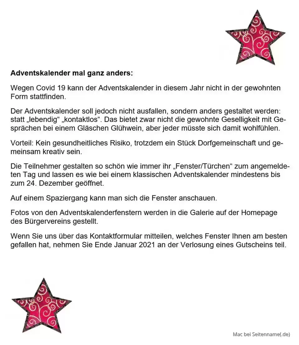Der diesjährige "Lebendige Adventskalender" wird nicht so ablaufen, wie wir ihn aus den letzten Jahren kennen. Dank COVID19 ! :/