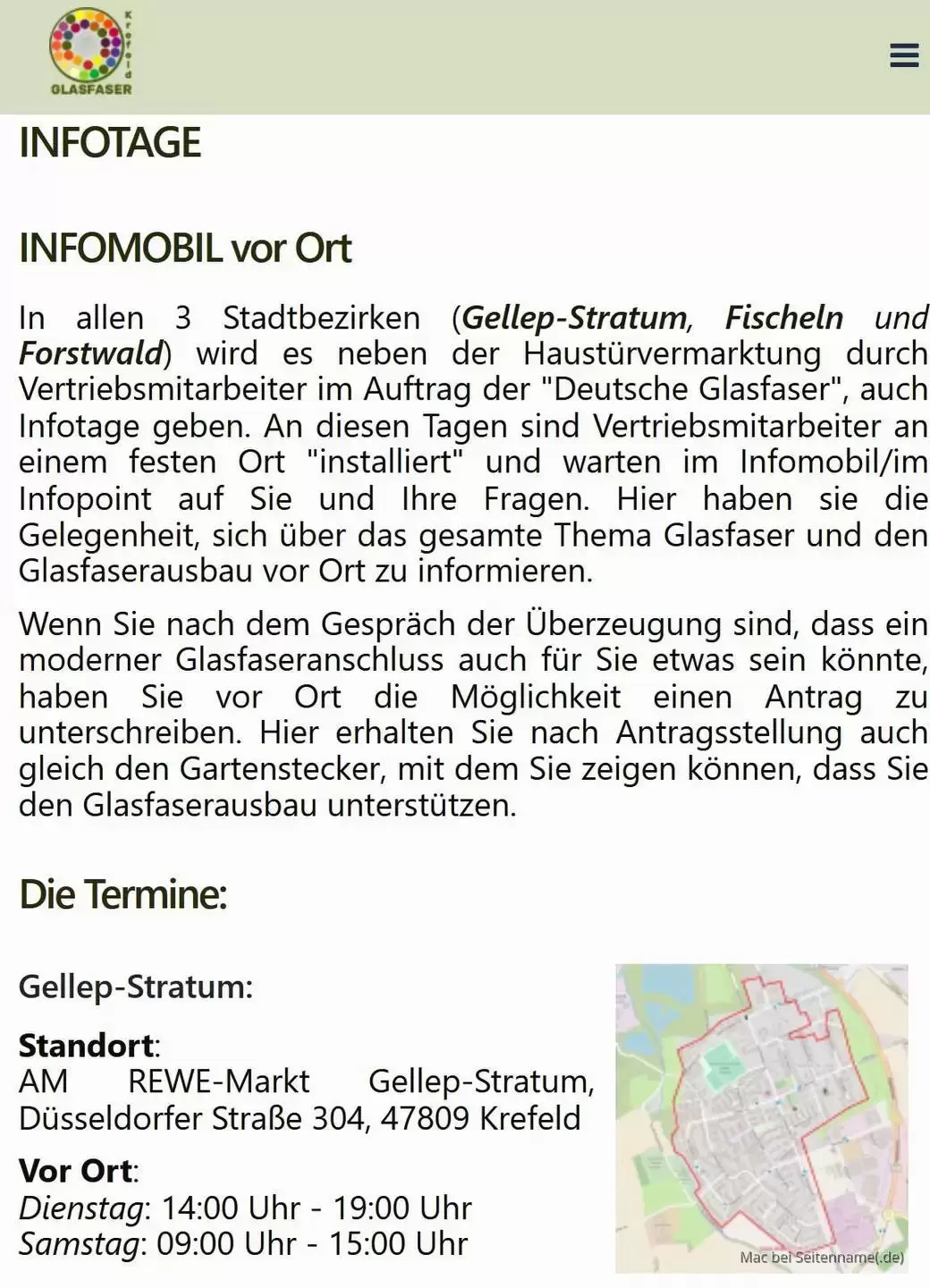 In allen 3 Stadtbezirken (Gellep-Stratum, Fischeln und Forstwald) wird es neben der Haustürvermarktung durch Vertriebsmitarbeiter im Auftrag der "Deutsche Glasfaser", auch Infotage geben, an denen Vertriebsmitarbeiter an einem festen Ort mit einem Infomobil auf Sie und Ihre Fragen warten. Hier haben sie die Gelegenheit, sich über das gesamte Thema Glasfaser und den Glasfaserausbau vor Ort zu informieren.