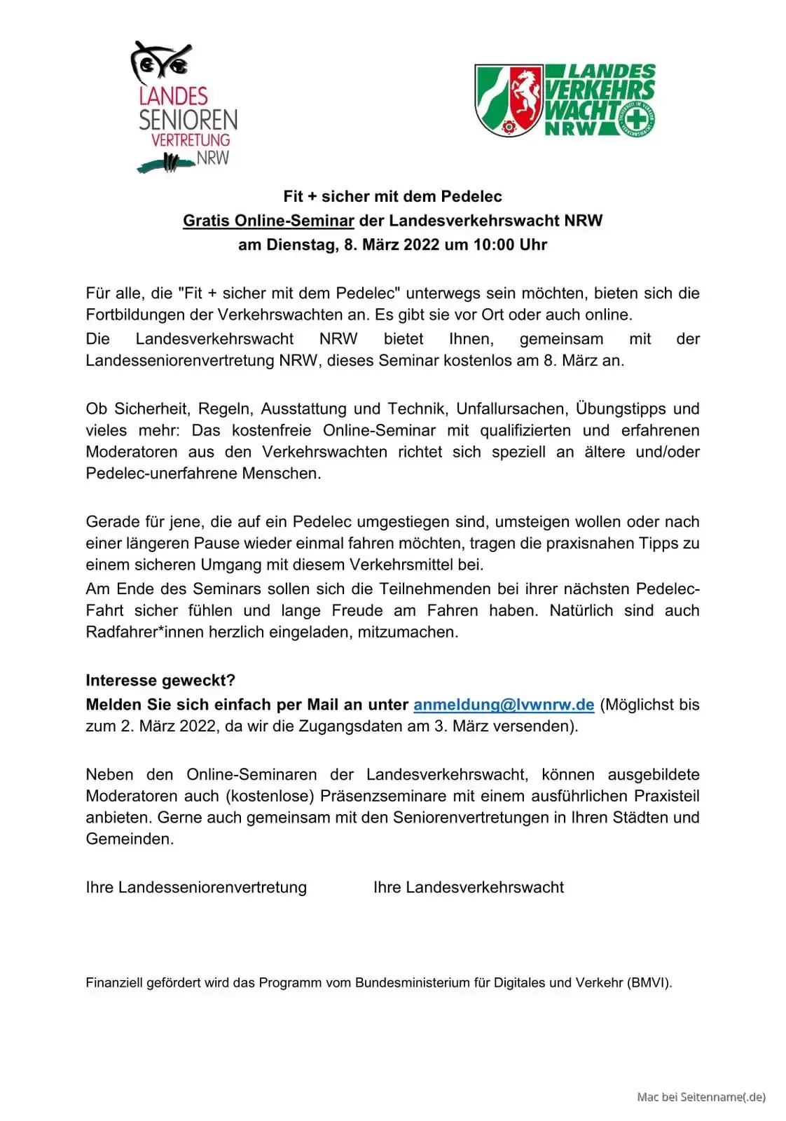 gern dürfen wir Ihnen das Angebot der Landesverkehrswacht NRW für ein Gratis Online Seminar zum Thema: „Fit + sicher mit dem Pedelec“ am Dienstag, 8. März 2022 um 10:00 Uhr anbieten.