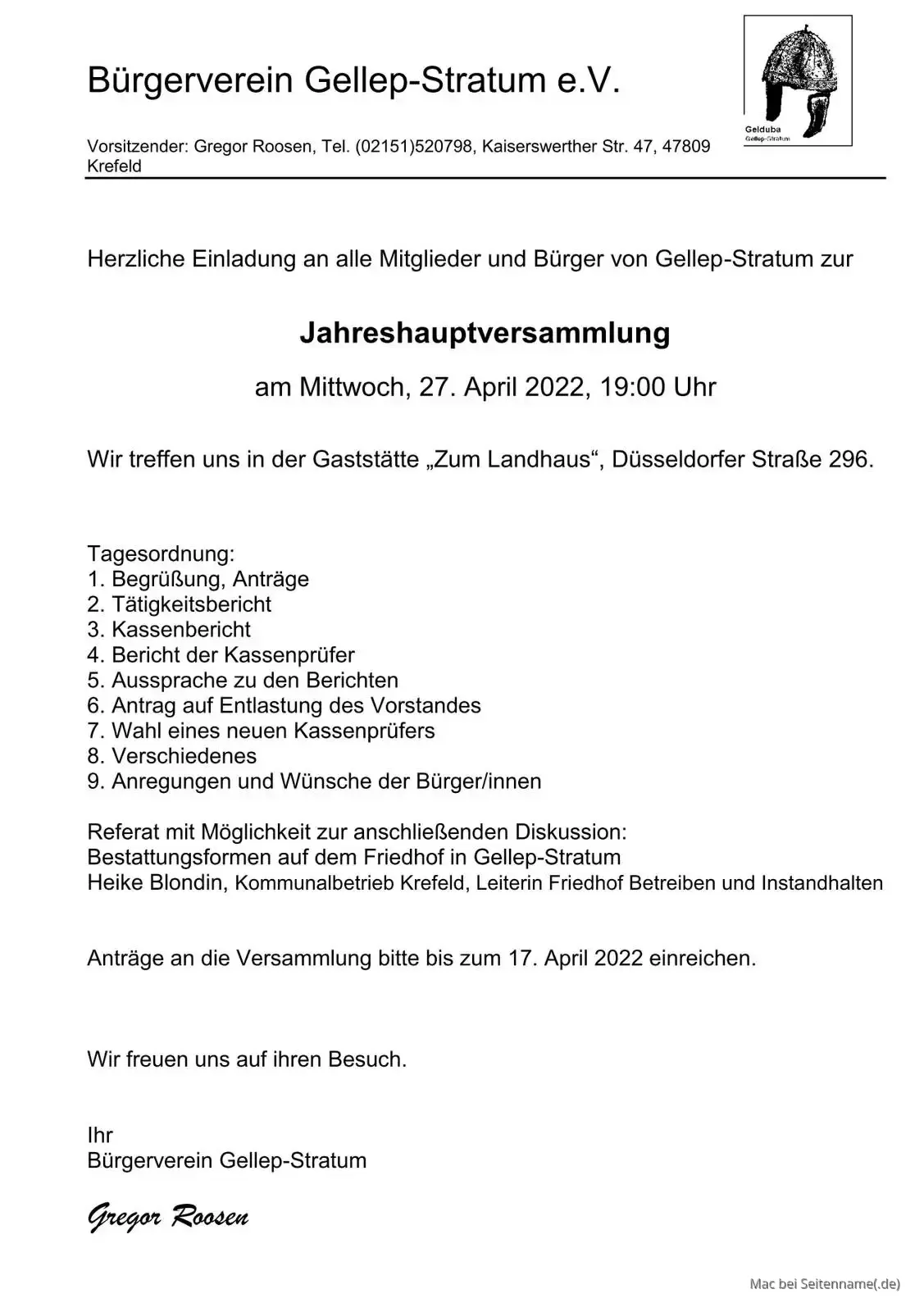27.4.2022: Jahreshauptversammlung Bürgerverein Gellep-Stratum