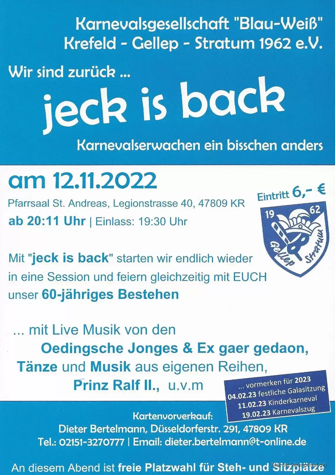 Mit "jeck is back" startet unsere ortsansässige KG Blau-Weiß in die Session 22/23 und lädt alle Närrinnen und Narren in den Pfarrsaal St. Andreas ein.
