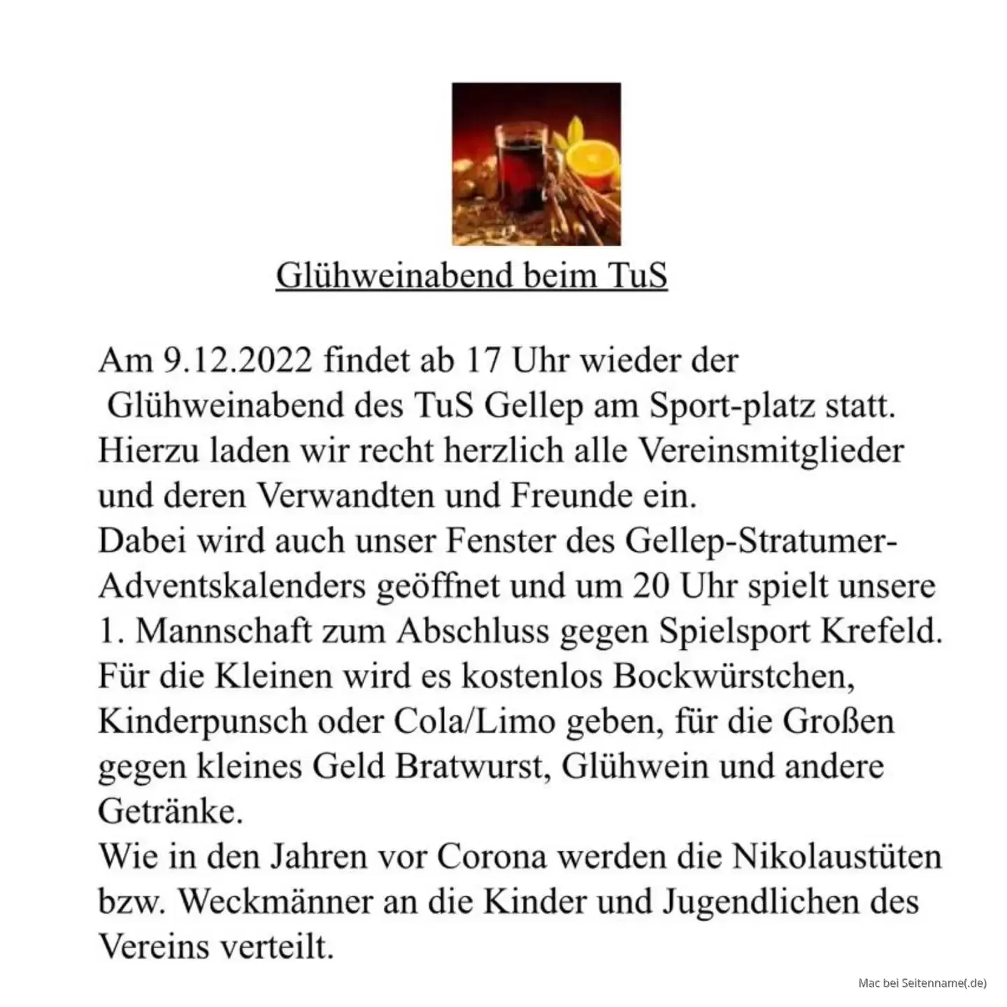 Am 09.12.2022 findet ab 17 Uhr der Glühweinabend des TuS Gellep am Sportplatz statt.