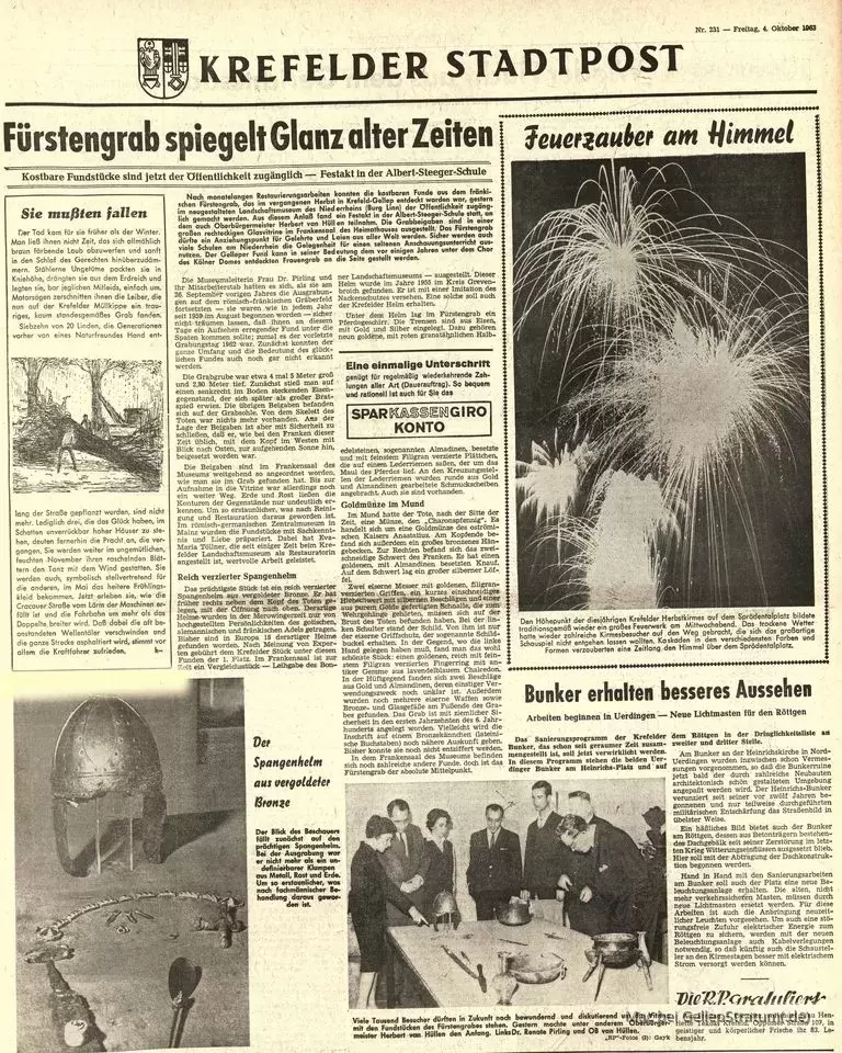 ZitatHeute vor 60 Jahren berichtete die RP ganzseitig über die erste Ausstellung der Funde aus dem fränkischen Gräberfeld, das im Herbst 1962 in Krefeld-Gellep entdeckt worden war.