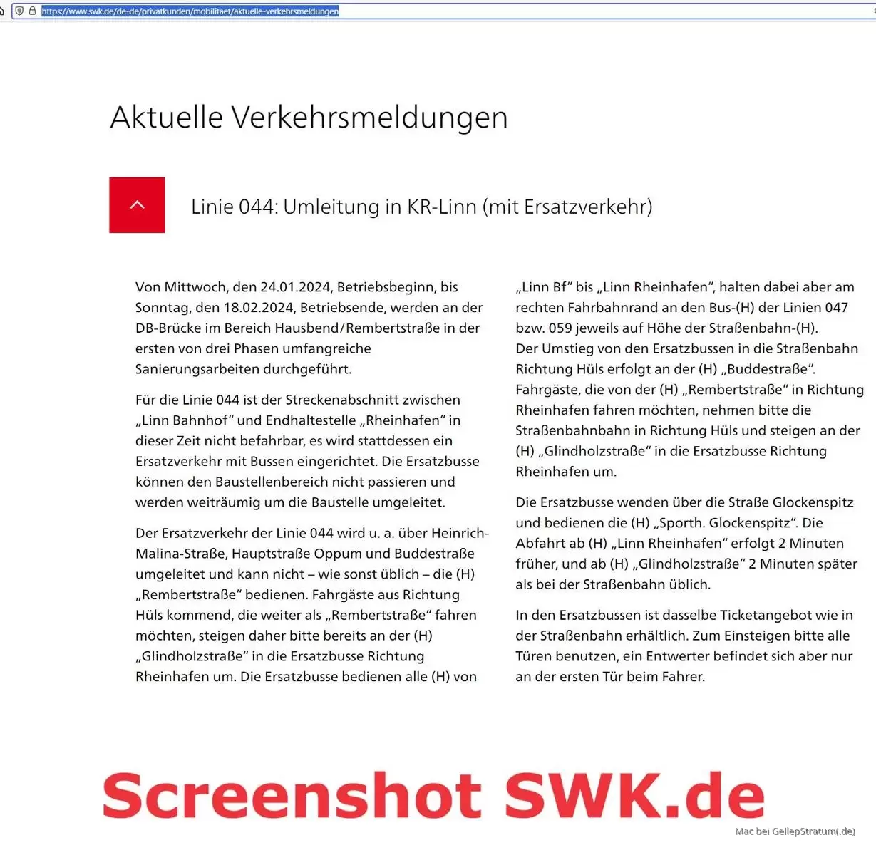 ZitatSWK: Von Mittwoch, den 24.01.2024, Betriebsbeginn, bis Sonntag, den 18.02.2024, Betriebsende, werden an der DB-Brücke im Bereich Hausbend/Rembertstraße in der ersten von drei Phasen umfangreiche Sanierungsarbeiten durchgeführt.