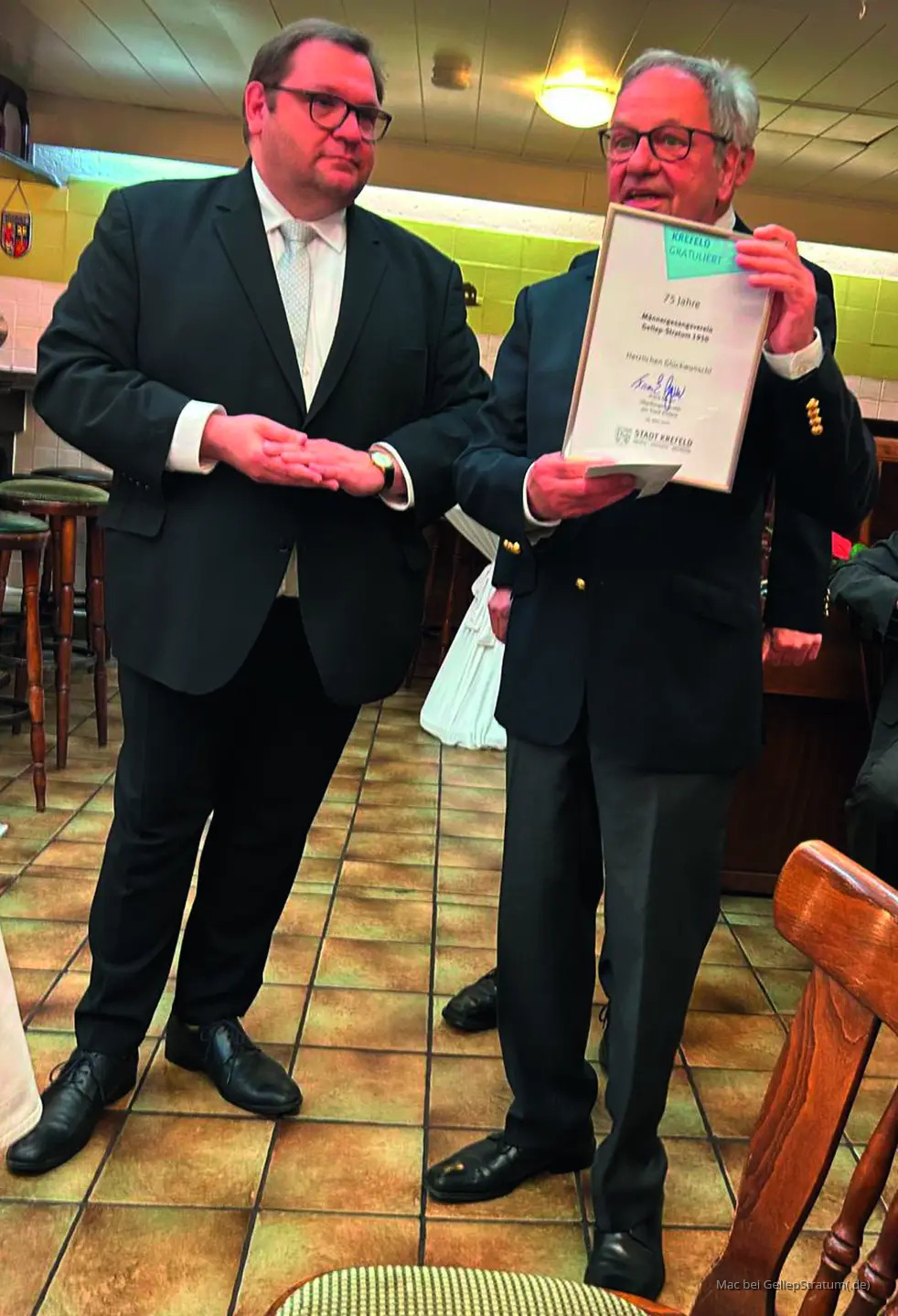 Krefelds Oberbürgermeister und Schirmherr Frank Meyer, der 1. Bürgermeister Timo Kühn sowie Uerdingens stellvertretender Bezirksvorsteher und Ratsherr Uli Lohmar ließen es sich nicht nehmen, bei Gottesdienst und anschließendem Jubiläums-Empfang in der Gaststätte Landhaus dabei zu sein.
