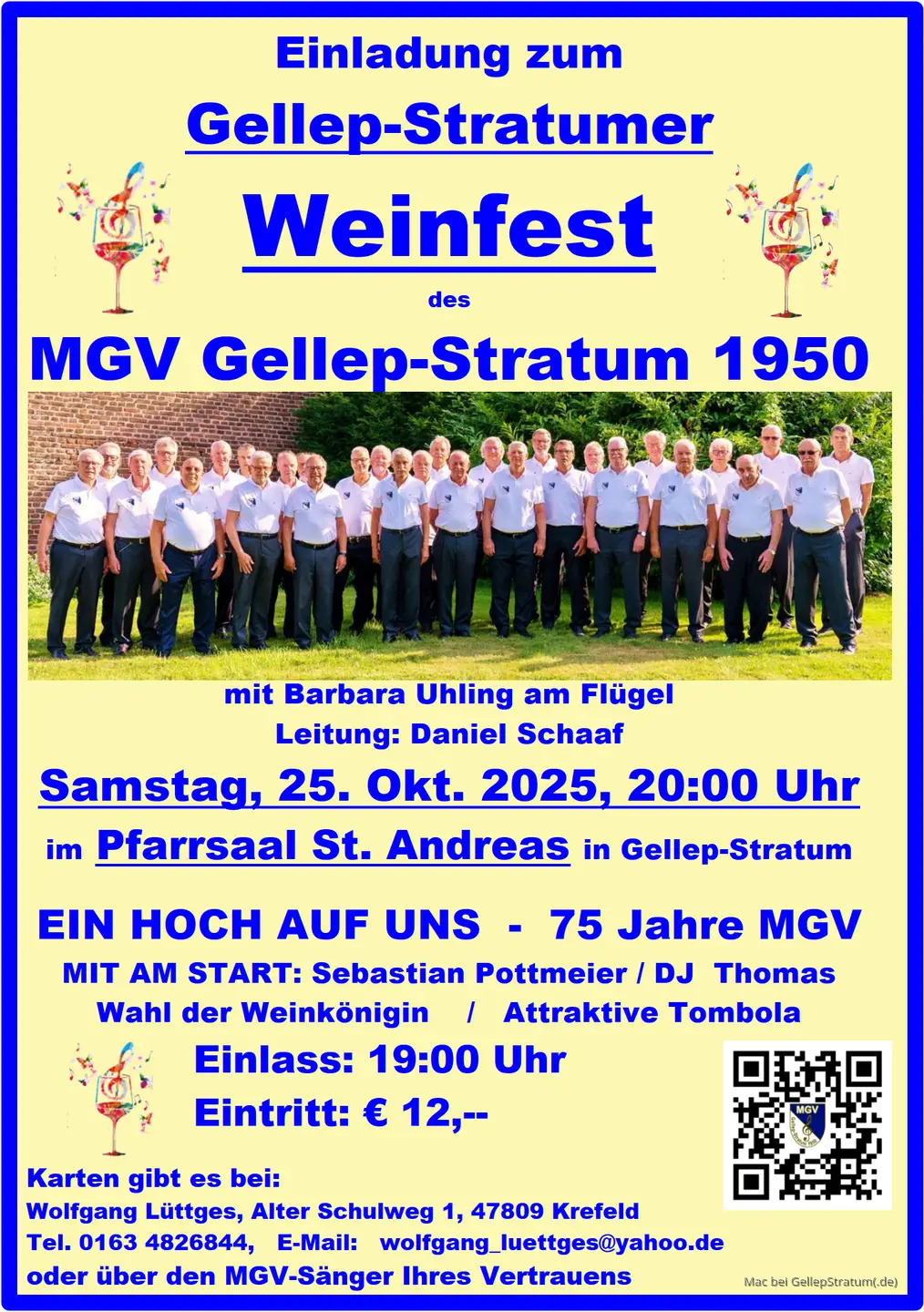 Unter dem Motto EIN HOCH AUF UNS – 75 Jahre MGV wollen wir im Pfarrsaal Str. Andreas, Legionstr. 40, 47809 Krefeld gemeinsam wieder einige paar schöne Stunden erleben.