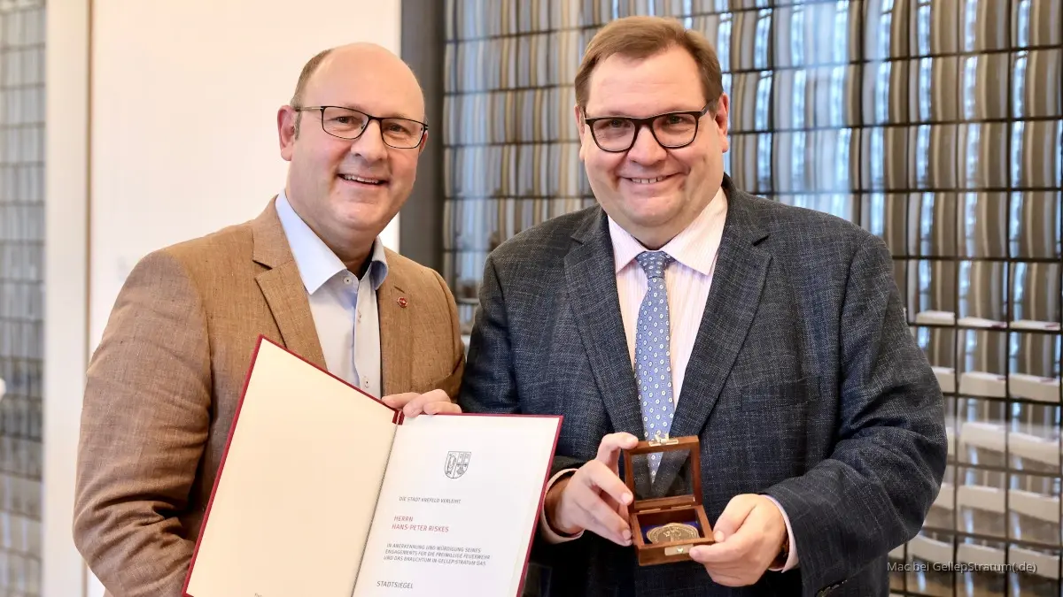 In einer feierlichen Stunde im Rathaus Krefeld übergab Oberbürgermeister Frank Meyer Hans-Peter Riskes das Stadtsiegel, aufgrund seiner vielzähligen Tätigkeiten für Gellep-Stratum und darüber hinaus.