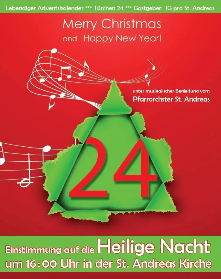 Im Rahmen des lebendigen Adventskalenders in Gellep-Stratum, wird das 24. Türchen am heiligen Abend im Rahmen einer kurzen Veranstaltung in der Kirche St. Andreas geöffnet.